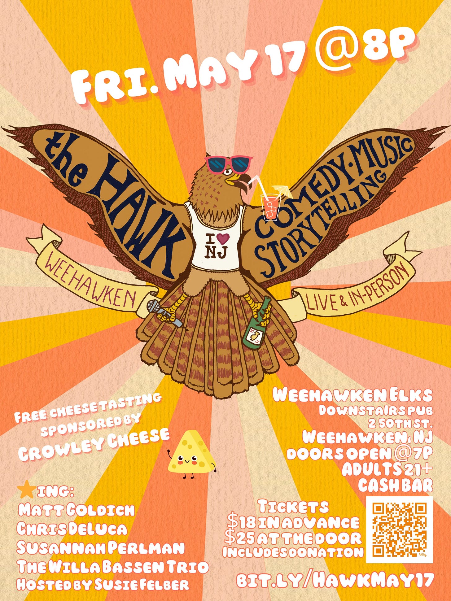 Get your tickets now here on Eventbrite. Free cheese starts at 7P after the doors open sponsored by Crowley Cheese (a tiny cheese factory in Vermont currently celebrating their 200th year).*** Show starts at 8P. It will sell out and the comedians and musicians are top notch.