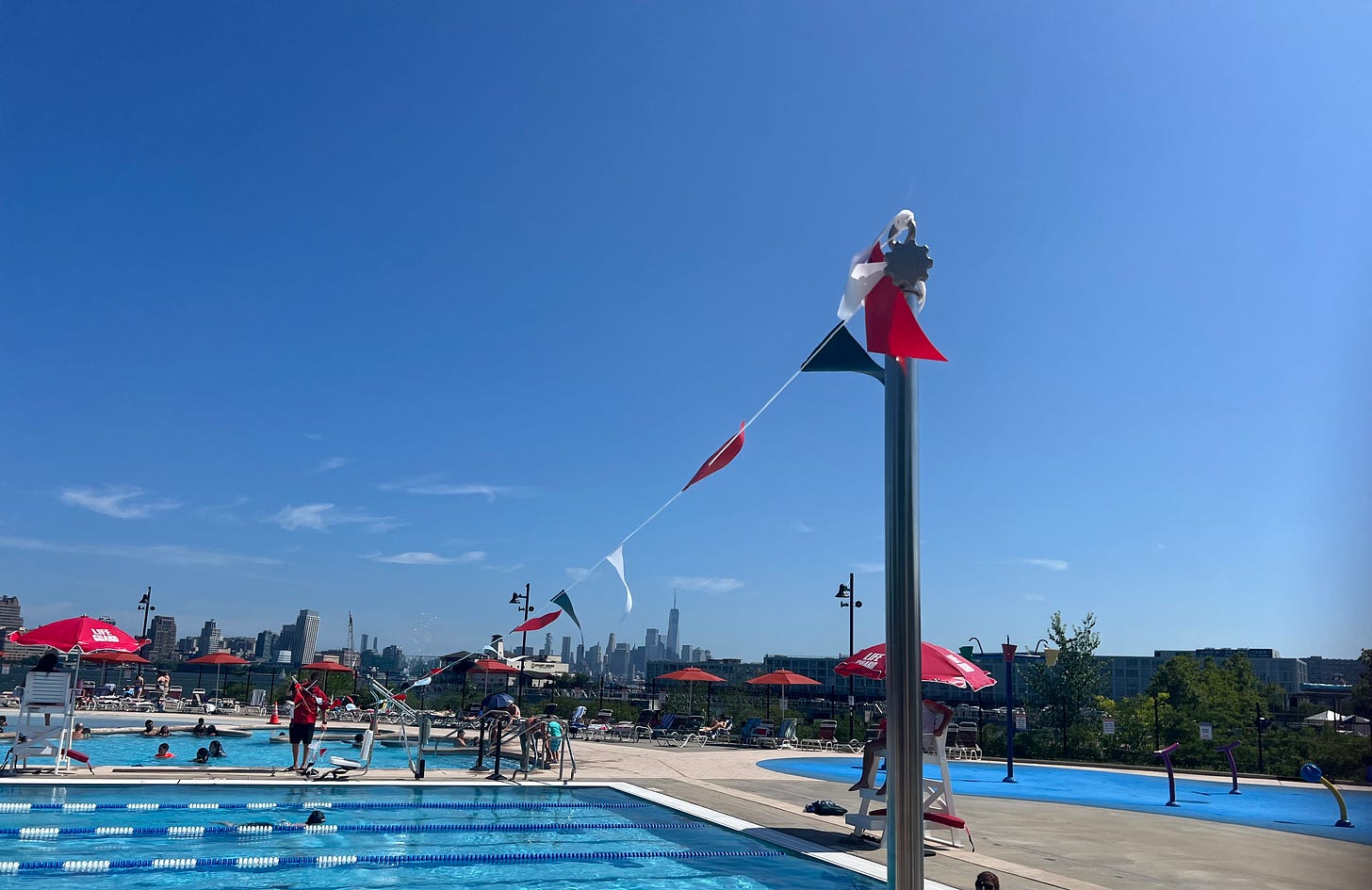 If you love to do the backstroke, but don’t love bonking your head on the side of the pool, backstroke flags are key. We had them in previous years, but this year we didn’t — until Wednesday afternoon. We learned they were donated by the Weehawken Swim Association, and co-founder Mike Lazzara was there on the scene helping affix them to the poles. What is the Weehawken Swim Association? Well, they are also known as the Rebel Aquatic Club, based in Rutherford, but some lessons they offer do take place in Weehawken. You can learn more and see the lessons they offer here: weehawkenswim.org