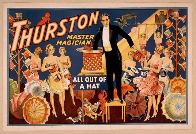 Although the name Houdini lives on, Thurston was his contemporary, and has been called the most famous magician of his time. He had a traveling magic show that was so big it “required eight train cars to transport his props across the country.” Source: Columbus Metropolitan Library