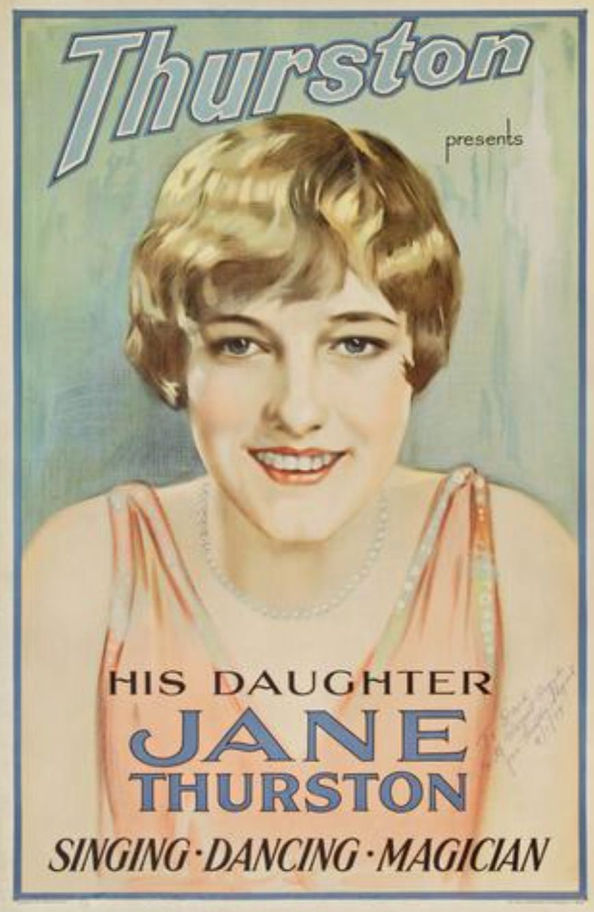 Thurston adopted Jane and Jane took his name and reportedly performed in his magic act as a teen, starting in the late 1920s, but the NY Times lists appearances as a performer starting in 1926. And in 1935 a short piece with no known source called her “the only woman magician on the stage.” What is interesting is Jane was left only $500 by her father, who left a nasty note in his will as to why. He claimed, among other things, that she caused “great mental anguish” and he said she was “generally undutiful to me.” Yikes.