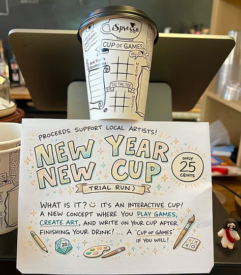 iSpresso, the local artsy Union City coffee spot, has new artist-designed cups to doodle and play on. They are only 25 cents and I can attest that it can make your morning buzz, buzzier.